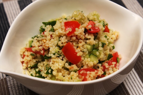 チキンレモンステーキで余ったクスクスでタブーリ(タブリ)サラダを。 タブーリサラダは本来クスクスでは無くブルグルを使って調理するトルコやギリシャなど中東の家庭料理です。クスクスは挽いたセモリナ粉で作るショートパスタですが、ブルグルはセモリナ小麦の挽き割りです。似ていますが全く違う食べ物なんですね。 クスクスに、きゅうり、トマト、フレッシュパセリのそれぞれ粗みじん切りを加え、オリーブオイル、お塩、クミンパウダー、オレガノ、たっぷりのレモン果汁で味付けします。後になってレンジ600Wで1分...