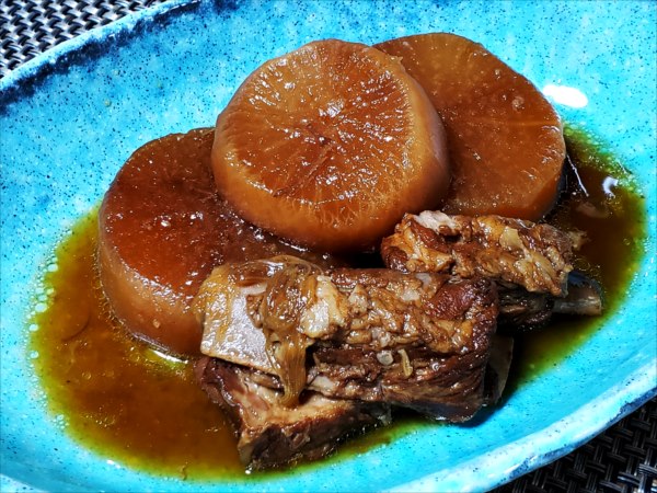 こちらがソーキと一緒に炊き込んだ染み染み大根であります。ソーキはゆでこぼしをしていますので余分な脂は落ち、思いの外さっぱりと頂けます(危)。大根にも風味が移ってとっても美味しい。鰤大根とは一味も二味も違った染み染み旨旨大根です。大根は皮を剥き面取りをして隠し包丁を入れ、お米少々と一緒に下茹でしてから使います。 添えたソーキはお肉が骨から落ちそう、とろとろ〜\(^O^)/ 一晩おいて、染み染みです。そして大根もとろっとろに柔らかいのです。口の中で舌で挟むだけで溶けていきます。 こち...