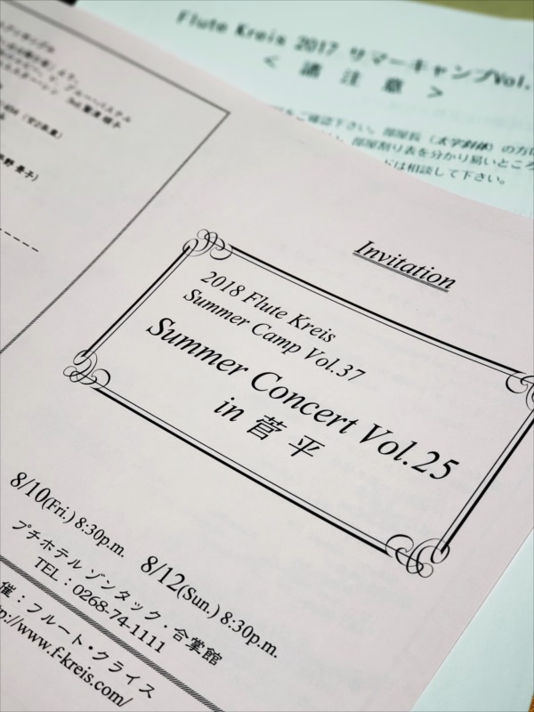 【2018フルートクライス・サマーキャンプVol.37】 ◆開催日時:2018.8月10日(金)〜8月13日(月) 3泊4日 ◆講 師:フルート・上坂 学、平野 景子 ピアノ・近藤 盟子 ◆会 場:プチホテル・ゾンタック ◆詳 細:こちらをご覧下さい ◆プロムナードコンサート・プログラム (コンサート全体のプログラムはこっちらから) ・C.Ph.E.バッハ:トリオソナタ ト長調 Wq.150(2Fl+Pf) ・バルトーク:ハンガリー農民組曲(Fl+Pf、平野) ・シューマン:ウィーンの謝肉祭の道化 Op.26...