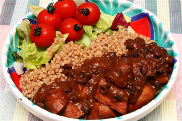 これ、9月に作ったフェイジョアーダ、豆は缶詰を使いトマトもコンソメもベイリーフも使って作った物です。旨旨です。 ソーセージ2種類にブロックベーコンをたくさん、ちょっと贅沢なフェイジョアーダです。 この時の試みはフェイジョアーダをクスクスで楽しもうという物。カナダ産、全粒粉の大粒クスクスで食べ応え十分、食感がしっかりしています。フェイジョアーダはシチューみたいな感じですから、何にかけても美味しいですね!(旨)一緒に添えてある生野菜も一緒に全部混ぜて、クスクスサラダのようにしても美...