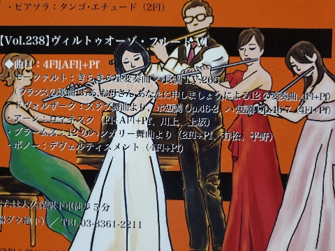 JUGEMテーマ:クラシック音楽 新しいフライヤーが出来ました♪ メンバー、みんな雰囲気そのままでステキ。Reikoさん、サスガです。 ◆Vol.236「世界音楽紀行」◆ ◆日 時:2020.3/28(土)7:00p.m.開演(6:30p.m.開場) ◆会 場:スペースDo(JR新大久保駅・大久保駅下車徒歩5分) TEL.03-3361-2211 ◆入場料:一般¥3,000− 学生¥1,500− (未就学児の入場はご遠慮下さい) ◆フライヤー両面拡大画像(デザインはReikoさん) ◆出 演:Fl.上坂 学、平野 景子 Pf.近藤 盟子...