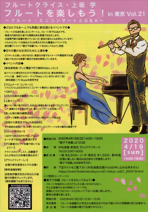 JUGEMテーマ:クラシック音楽 久々のジーマン、楽しく熱い音楽がコロナも吹き飛ばしてくれそうです。 ガンバリマス! ◆Vol.236「世界音楽紀行」◆ ◆日 時:2020.3/28(土)7:00p.m.開演(6:30p.m.開場) ◆会 場:スペースDo(JR新大久保駅・大久保駅下車徒歩5分) TEL.03-3361-2211 ◆入場料:一般¥3,000− 学生¥1,500− (未就学児の入場はご遠慮下さい) ◆フライヤー両面拡大画像(デザインはReikoさん) ◆出 演:Fl.上坂 学、平野 景子 Pf.近藤 盟子 ◆お話し:...