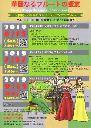 JUGEMテーマ:クラシック音楽 昨日のモーツァルトの余韻が残る耳に、いよいよバッハを送り込みます。 難しいけれど好き、好きだけど難しい。 ピアノコンチェルトとは調が違って、短調だけど明るい感じがします。 フルートコンチェルト、是非お楽しみに!! <<クライス・フルート・ソロイスツ>> ◆Vol.230「ソロライブ・I〜バッハアーベント」 ◆日 時:2019.6/15(土)7:00p.m.開演(6:30p.m.開場) ◆会 場:スペースDo(JR新大久保駅・大久保駅下車徒歩5分) TEL...