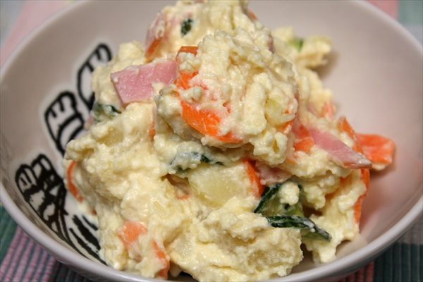 先日伺った島屋さんで頂いて来た豆乳とさいたまの豆腐を使ってポテトサラダを作りました。 ・じゃがいも(中4個)を茹でて粗く潰す。 食べた時にごろごろとじゃがいもを感じるように。 ・人参1本、きゅうり1本をスラーサーで薄く切り、 塩もみして水分をよく絞っておく。 ・ハム(3枚)を直径の1/2の長さの短冊切りにしておく。 ・さいたまの豆腐1丁を水切りしておく。 水を張った大きな鍋を乗せること20分ほど。 ・じゃがいもが冷めたら人参ときゅうり、ハム、水切りした さいたまの豆腐を手で崩し...