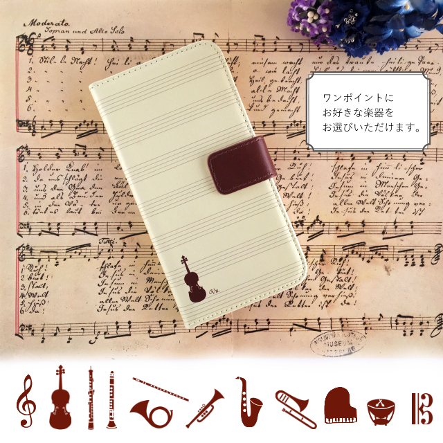 皆様こんにちは! 本日は<手帳型スマホケース 楽器>シリーズ第3弾のご案内です。 <手帳型スマホケース 楽器(C)> 第3弾の楽器シリーズは白に近いクリーム色をベースに、マグネットのベルトと楽器、五線をブラウンでデザインしました。 シンプルなクリーム色に、チョコレートのようなブラウンが可愛い手帳型スマホケースが出来上がりました。 楽器(記号含む)の種類は変わらず18種類からお選びいただけます。 裏面のデザインは、ベルト部分の色がその...