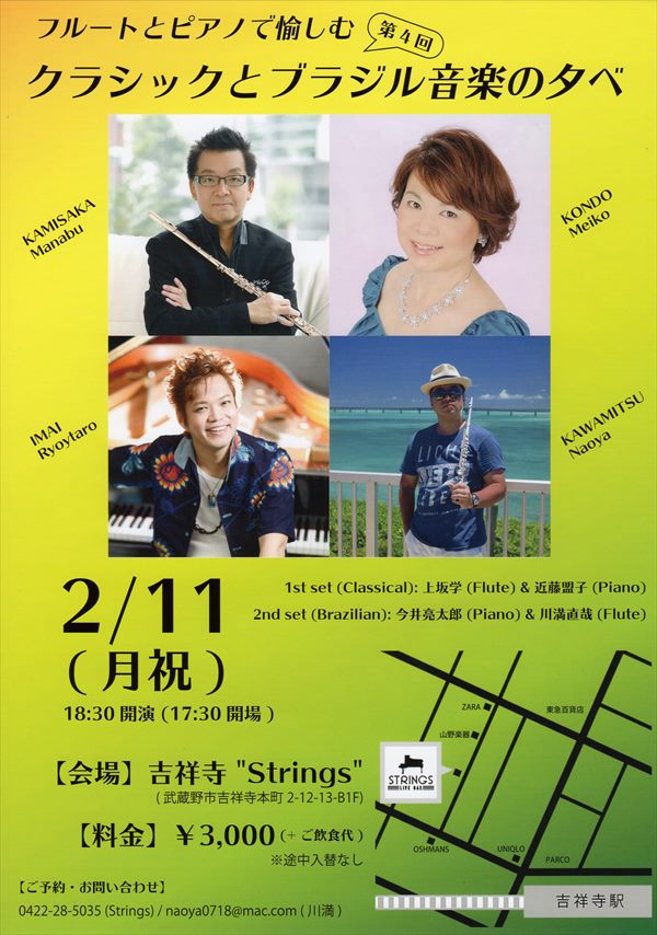 JUGEMテーマ:クラシック音楽 クラシックを身近に楽しく聞いて頂けます様、張り切って練習中!! 【フルートとピアノで愉しむ クラシックとブラジル音楽の夕べ(第4回)】 ■開催日時:2019.2/11(月・祝) 18:30〜/20:00〜 (入替なし) ■会 場:吉祥寺Strings(武蔵野市吉祥寺本町2-12-13 B1F) ■料 金:¥3,000−(+ご飲食代) ■出 演:クラシック:上坂 学(Flute)、 近藤 盟子(Piano) ブラジル音楽:川満 直哉(Flute)、今井 亮太...