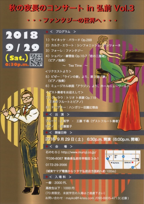 JUGEMテーマ:クラシック音楽 弘前でのコンサート、今年は”ファンタジー”がテーマです。 カルク=エラートやビゼーの個性溢れる世界観が魅力です。 是非!お越し下さい♪ Designed by Reiko 秋の夜長のコンサート in 弘前Vol.3 ・・・ファンタジーの世界・・・ ◆日 時:2018.9/29(土)6:30p.m.開演(6:00p.m.開場) ◆会 場:〒036-8087 青森県弘前市早稲田 3-9-1 Tel.0172-29-3566 フライヤー掲載の地図も参考にご覧下さい ◆入場料:一般...