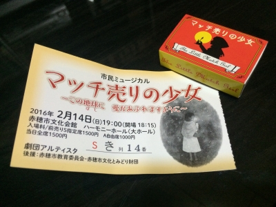 2月14日、赤穂アルティスタによる市民ミュージカル「マッチ売りの少女」の公演の様子をレポートします。公演当日、鳥取から赤穂へ出発お昼過ぎに到着し、早速フィナーレ曲の練習に入ります。作曲家の先生から「もっと言葉をハッキリと。歌いだしが遅れないように!」と指示が入ります。自分たちで練習してきましたが、やはり本番皆で合わせるのは難しいです。続いてゲネプロを見学。ムジークテアターTOTTORIの皆はこの時点で物語に心を打たれ、涙を流すメンバーもいました。そして開場時間が近づき、ついに本番を迎えます。(ここから...