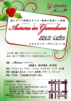 恒例?となりました横浜・元町の”Granduca”でのクリスマス・ディナー・コンサート(別名オペラ会)は2014年12月7日に無事終わりました。 南イタリアのクリスマスのお料理とアウローラの歌声の共演による、楽しい夜でした。 また皆様にお会いできる日を楽しみにしております。 JUGEMテーマ:オペラ グランドゥーカのオーナーシェフ齋藤竜治氏を囲んで