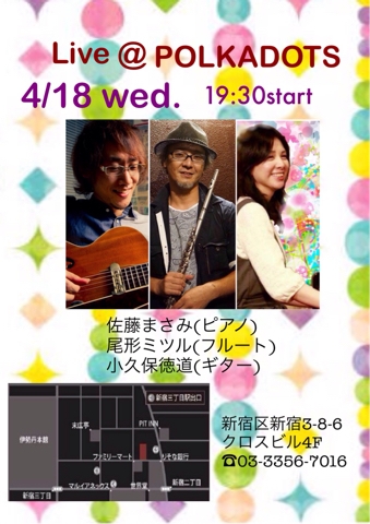 ★4/18(水)新宿三丁目 PolkaDots http://www.jazz-polkadots.com/access/ 佐藤まさみ(ピアノ) 尾形ミツル(フルート) 小久保徳通(ギター) 19:30〜 2stages チップ制 様々なジャンルの音楽を演奏している凄腕のおふたりと2度目のライブです 今回は私のオリジナルとジャズのナンバーを中心に演奏します 是非ご予定に入れて頂けると嬉しいです♪