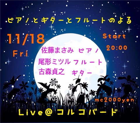 ★11/2(水)新宿 Jazzspot J http://www.jazzspot-j.com/index.html 河村留理子(vocal)クミコ・カーロ(vocal)&中山憲一(bass)トリオ 佐藤まさみ(piano)内田修一(drums) [開始時間:19:15〜 20:45〜 22:15〜] [テーブルチャージ:¥500 ミュージックチャージ¥3,000] セッションあり!楽器を持って遊びに来てね♪ ★11/9(水) 新橋 cafe cottonclub http://sb.cafecottonclub 19:30~ 4stage BGM演奏♪ Mai(ボーカル) 佐藤まさみ(ピアノ) ★11/14(月...