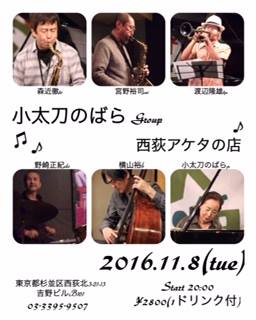 JUGEMテーマ:ジャズ 本日11/8(火)はこちら← 小太刀さんはピアノの単音だけで自分の世界に引き込める 凄い人です。 宮野さんとの共演も嬉しい限りです。