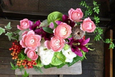 オータムブーケレッスン開催 お昼の部 9月14日(水) 13:30〜 *** ジャズライブ出演のお祝用に横浜市へお送りしました。 温かみのあるピンクのバラ、ラシャンスに、 赤紫のユリやちょっと個性的なお花、バンクシャーなどを合わせて。 ボーカルの女の子宛です。 ジャズライブ行って歌声聴いてみたかったなぁ〜。 *** 人形町で行...