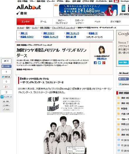 メディア掲載のお知らせです。 先日の『加賀テツヤ7回忌メモリアル ~ザ・リンド&リンダース ラストステージ~』に関して総合情報サイトAll Aboutでレポート記事が掲載されております。 http://allabout.co.jp/gm/gc/435358/ 当日のステージの模様、ザ・タイガースの瞳みのるさん、オックスの真木ひでとさんからいただいたメッセージなどが掲載されております。 お越しになった方も、お越しになれなかった方もぜひお目通しいただければと思います。 JUGEMテーマ:グループサウンズ