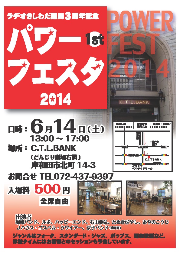 リンド&リンダース、堀こうじの新バンド『堀嶋バンド』が6月14日(土)に開催されるラヂオきしわだのイベント『パワーフェスタ2014』に出演いたします。 以下、イベント情報はラヂオきしわだサイトより転載です。 ------------------------------------------------------------------------------------------------ ラヂオきしわだ開局3周年を記念して、ライブ・イベントを開催します。 ●日時6月14日(土)13:00〜17:00迄 ●場所C・T・L・BANK(岸和田市北町14-3 だんじり劇場隣、岸和田駅よ...