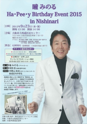 出 演 瞳 みのる 宇野山和夫 他 日 時 2015年9月23日(水・祝) 開場13:00 開演14:00 会 場 大阪市立西成区民センター 〒557-0041 大阪市西成区岸里1丁目1-50 アクセス >> 地下鉄四つ橋線「岸里」駅2号出口東へ徒歩1分 地下鉄堺筋線・南海本線・高野線「天下茶屋」駅西出口南へ徒歩5分 金額 指定¥4,800(前売・当日共/税込) 備考 未就学児童入場不可 チケット お取扱い /お問合せ ...