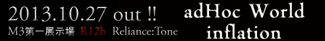 JUGEMテーマ:同人音楽流歌さんと染川裕紀さんの新ユニット「adHoc World」が今回の秋M3にて、1stCDをリリースされますので、その応援日記となります。------------------------------------------------------------------------------『inflation』M3 頒布スペース 第一展示場 スペースNo. R-12b Reliance:Tone個人の作曲活動、project -ALCA-、encounter+での過去の活動等々、独自の視点(切り口)から世界観のある音楽を創造し続ける流歌さんと、流歌さんの作品を始め、色んなアーティストのもとで魅力的な演奏を奏でている、ベーシ...