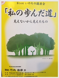 JUGEMテーマ:今日、こんなこと、あんなこと、あった。 昨日、大村シーハットさくらホールにて「大村いのちを大切にする会・ 大村家庭教育を考える会」主催の講演会がありました。 講師は岡山県立盲学校講師の竹内雅彦先生でした。 http://haikei-takeuchi.jp/profile/ 先生は7歳のとき網膜剥離により失明されたそうです。 「行きたい学校へ入れん。好きな人に振られる。やりたい仕事に就けん。人生は思い通りにならん。 でもその時ボヤいても始まらん。目の見えん人生を...