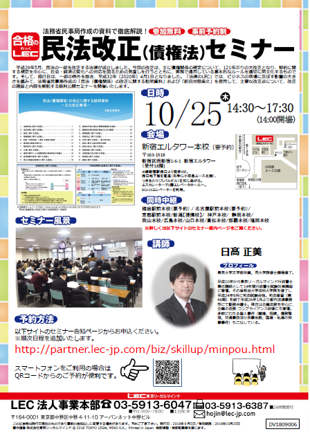 JUGEMテーマ:気になったニュース 皆様こんにちは。 LEC法人事業本部 朴です。 累計申込2500名!大好評の債権法改正セミナーが復活しました! 10月25日(木)14:30〜17:30 開催【参加無料・全国同時中継有】 2020年4月1日、約120年ぶりの大改正となる改正民法(債権法)が施行されます。 その影響の大きさを鑑み、『法律のLEC』では、法務省民事局が作成・公表している資料を使用して、日? 正美講師による無料解説セミナーを開催しています! すでに全国...