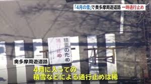 JUGEMテーマ:気になったニュース 2日朝は厳しい冷え込みとなりましたが、東京・奥多摩の奥多摩周遊道路が積雪などの影響で一時通行止めとなりました。4月に入っての積雪での通行止めは珍しいということです。 奥多摩なら雪も積もるでしょ☃ 引用:https://news.tbs.co.jp/newseye/tbs_newseye3637236.html