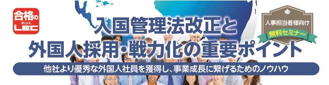 JUGEMテーマ:資格 JUGEMテーマ:気になったニュース 皆様こんにちは。 LEC法人事業本部 朴です。 1月29日(火)14:30〜入国管理法改正と外国人採用・戦力化の重要ポイント 〜他社より優秀な外国人社員を獲得し、事業成長に繋げるためのノウハウ〜を伝授します! セミナー概要 人材確保が困難となっている国内において、今後の事業成長や競合他社に差をつけるためには優秀な外国人を採用し活用していくことが重要となります。しかしながら、まだまだ国内におい...