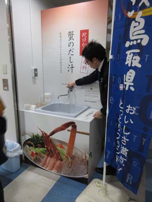 帰省中だった・・・ 息子が、長い冬休みも終わり空港まで見送りに。 ニュースで・・・ 知っていたが、なんと蛇口からアツアツの「カニ汁」が出る。 鳥取県境港は・・・ 「紅ズワイガニ」の水揚げ量が日本一! それを宣伝しようと、思いついたらしいのだが 愛媛県(だったかな?)空港の蛇口からミカンジュースが。 空港内コンビニの・・・ すぐ脇にあるので、おにぎりでも買えば『満腹?』(笑) 二番煎じか?・・・ 二番でも三番でも良いのだが、確カニ美味い! カニ取県(ウェル...