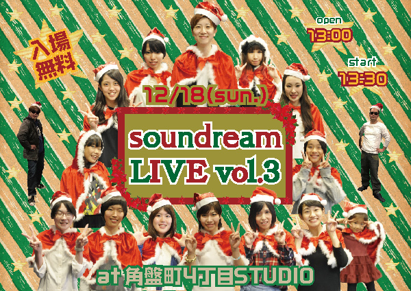 JUGEMテーマ:ミュージックスクール -soundream- 12月ですッッ 1年は本当にあっという間! いつもレッスンやライブで本当にお世話になっているTSUTAYA角盤町店さん、 そして角4STUDIOさんも、昨年12月にリニューアルオープンされてから1周年を迎えられました! おめでとうございます これからもどうぞよろしくお願いいたしますっ soundreamもレッスンが始まりもうすぐ1年となります。 毎月のように新メンバーを迎えながらレッスンとライブを繰り返してきました。 12/18に開催するのsou...