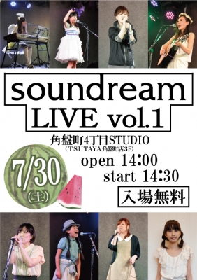 JUGEMテーマ:ミュージックスクール -soundream- soundream LIVE vol.1 開催させていただきます ※ 当LIVEは終了いたしました。ご来場誠にありがとうございました。 soundream LIVE Vol.1 @TSUTAYA角盤町店3F 角盤町4丁目STUDIO [ 日 時 ]2016年7月30日(土) [ 時 間 ]OPEN 14:00 / START 14:30 [ 料 金 ]入場無料 【 出演者 】(※順不同) ATSUKI 飛 鳥 けいこ RIO YUZU 琴 Rino...