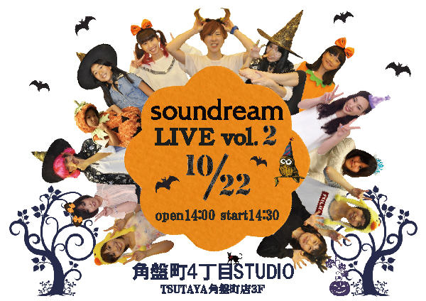 JUGEMテーマ:ミュージックスクール -soundream- 2016/10/22(土)にsoundream LIVE vol.2を開催させていただきます! soundream LIVE vol.2 [日 付]2016年10月22日(土) [時 間]OPEN14:00/START 14:30 [場 所]角盤町4丁目STUDIO(TSUTAYA角盤町店3F) ※ ご入場は無料です 【 LIVE出演者 】(五十音順) あ き 飛 鳥 ATSUKI ...