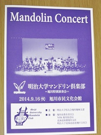 JUGEMテーマ:北海道な日々 JUGEMテーマ:マンドリン この秋、いけこは、3つのマンドリンコンサートに行ってきましたよ! 明大校友会旭川地域支部主催 明治大学マンドリン倶楽部 旭川特別演奏会 2014年9月16日(火)午後6時 旭川市民文化会館大ホール 入場料 2,000円 世の中の多くの方がたが、「マンドリンといえば明大」と言っているのを、へえ〜そうなんだーと聞いていましたが、はじめて見て、びっくりしました! 各パートの第1プルトの楽器前に、なんとマイクが! 打楽器や管楽器もいっぱいだし、アコー...