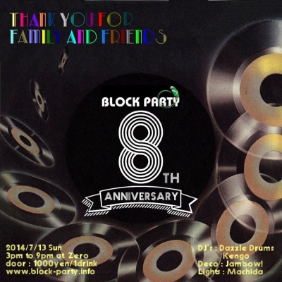 Block Partyというパーティを始めて、無事8周年を迎えることが出来て、まずは、とにかくいらして下さった皆様、本当に有難うございました。Dazzle Drumsはここで毎月、皆さんに支えられ鍛えられていくうちに、色んなことを吸収して学んでいきました。たとえば数年前ならば定番のクラシックスを(多くのソウルフルハウスのDJがしているように)何曲も何曲も繋ぐことにさほど抵抗の無かった私達が、いやもっと違う形があるんじゃないか、そして新譜で同じようにお客さんを楽しませられるようにしたい、などなどの表現する側のエゴもしく...