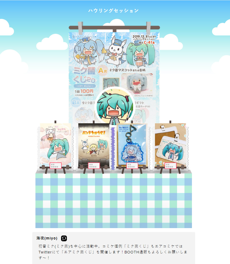 こんにちは、海夜です! 本来なら今日はGWコミケの4日目でサークル参加してた日ですが…。 残念ながらコロナの影響で中止になってしまいました(´・ω・`) しかも久々のお誕生日席だったのに…(^o^;) 今回はコミックマーケット公式が「エアコミケ」を開催する。という事でしたので、少しだけ便乗して参加してみる事にしました〜!(´∇`) エアコミケ用のサークルスペースメーカーでそれっぽくしてみましたw BOOTH通販は常時受付中です☆【ハチミツBOOTH】 いつものコミケ恒例「ミク菌くじ...