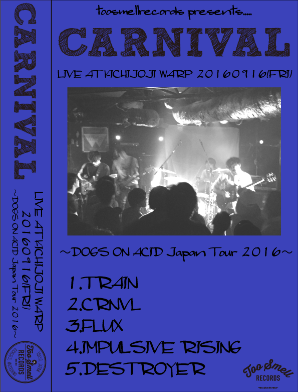 【LTD.200】 CARNIVAL 『LIVE AT KICHIJOJI WARP〜Dogs On Acid Japan Tour 2016/9/16(FRI)〜』 Cassette Tape+MP3ダウンロードコード ¥800(tax in) 【TRACK LIST】 1.TRAIN 2.CRNVL 3.FLUX(新曲) 4.Impulsive Rising 5.DESTROYER カセットストアデイリリース第三弾!!! dry as...