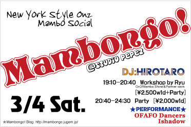 DJ:Hirotaro Special Lesson by Ryu 【レッスン内容】 より楽しく気持ちよく、そしてよりかっこよく踊るためには何を意識したらいいの? 上級者と言われる人は何が違うの? ソーシャルで使えるシャインステップとペアワーク(スタイリング含む)を交えながら、それらの疑問にお答えします! Performance:OFAFO Dancers Ishadow ◆◆◆Mambongo! 3/4 Sat.◆◆◆ 3月4日(Sat) 19:10-24:30 六本木Studio PEPE-2 港区六本木7-17-2 ビジネスアパートメンツB1 ...