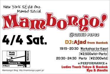 DJ:Ajad from Bankok 【春のスペシャルWS】レディース限定! Mambo, ChaChaCha, Bachataのための ボディムーブメント&スタイリング 19:15-20:30 インストラクター by Kaori マンボもチャチャもバチャータも... もっとセクシーに踊りたい女性のためのスペシャルレッスン第2弾 ! 大好評だった前回WSより時間を延長し、さらに濃厚なメニューを投入しました。 上半身と下半...
