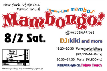 Summertime Mambongo! Workshop: Mitsue "真夏のSabooor! Bachata" DJ:kiki Performance:Tokyo Touch ◆◆◆Mambongo! 8/2 Sat.◆◆◆ 8月2日(Sat) 19:20-24:30 六本木Studio PEPE-2 港区六本木7-17-2 ビジネスアパートメンツB1 [MAP]http://www.studio-pepe.com/map.html Address: 7-17-12-B1,Roppongi, Minato-ku Tokyo (Tokyo Metro Hibiya Line Roppongi Station 2-minute...