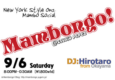Mambongo!9.6 Sat. DJ:Hirotaro from Okayama 〜夏の終わりに聴きたいマンボ〜 過ぎゆく夏の日を想うと何故か切ない.. そんな今宵は DJ HirotaroのSabor溢れるプレイで 夏の果てまで踊ッテQ! 【緊急告知】レディース限定! Kaori's★1コイン★レッスン Mambo/On2, ChaChaCha, Bachataのための ボディムーブメント&スタイリング 19:30-20:20 マンボもチャチャも...