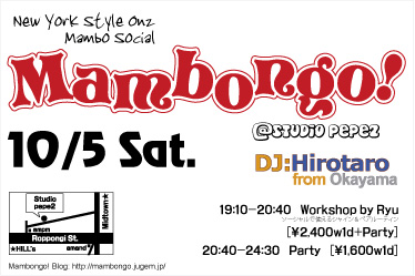 Workshop: RyuOn2/Mambo SpecialRyu's Mambo Special!! ソーシャルで使えるシャイン&ペアルーティーンスタイリングをご紹介する中で、より多くの人とより楽しくかっこよく踊るためのコツをお伝えします。これだけの意識で、こんなに上手く踊れるようになるんだと実感してもらえるものになっています。是非是非お待ちしています!!! DJ:Hirotaro from Okayama ◆◆◆Mambongo! 10/5 Sat.◆◆◆10月5日(Sat) 19:10-24:30 六本木Studio PEPE-2 港区六本木7-17-2 ビジネスアパートメンツB1 [MAP]http://www.studio-p...