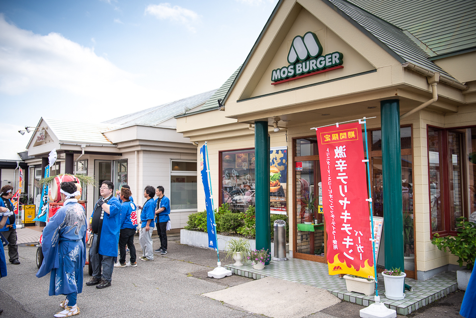 仕事を片付けたり、昼寝をし過ぎたりと、なんだかんだありまして、合流したのは14:30くらいでした。 モスバーガーでの門付けを終えたところで、 モスバーガー様からは、ポテトとオニオンフライが振舞われていました。ごちそうさまでした。 門付けと言えば、集落の家を一軒一軒回るイメージしかなく、 普段客として行くような店舗を次々と門付けして回る様子は、とても新鮮に感じました。 門付け中でも、お...