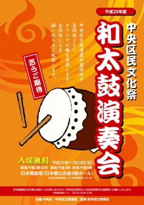 JUGEMテーマ:地域/ローカル JUGEMテーマ:和太鼓 ◎和太鼓演奏会チラシ (画像をクリックすると拡大します) ◎地図 (画像をクリックすると拡大します) 11月24日(日)に日本橋蛎殻町の日本橋劇場にて中央区太鼓連盟による和太鼓演奏会が行われます。 時間は15時からの開演となります。 もちろん青年部員が入っている越一太鼓も出ます。 他にも出演する団体は ・新富太鼓の会 ・中央区立佃中学校 月島太鼓部 ・築地本願寺太鼓保存会 ・堀留公園太鼓の会 そして連盟の若手...
