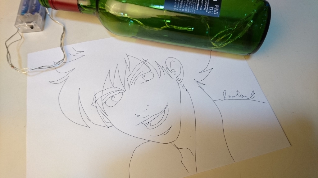 JUGEMテーマ:芸能情報、テレビ・音楽ニュース フライングメリークリスマス! INORANさん。 今回はワイン瓶のイルミネーション。 でもそう見えない。 100均で買ったライトだけれど、 ちょっと接触が悪くて、 ついたり消えたり。 スイッチを入れてるのに、 灯がみるみるちいさくなったり がっくり がっくりだよー 今回も一発画です。