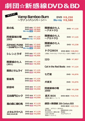 2020年2月15日(土)〜3月24日(火) <TBS赤坂ACTシアター>で上演される、いのうえ歌舞伎『偽義経冥界歌』。公演会場ロビー<物販コーナー>にて、新感線&出演者関連のDVD(&BD)の販売致します。 ご来場の際には、<物販コーナー>にもぜひお立ち寄りください! ●劇団☆新感線 関連作 『Vamp Bamboo Burn〜ヴァン!バン!バーン!〜』DVD&Blu-ray 『蒼の乱』DVD&Blu-ray 『阿修羅城の瞳2003』GEKI×CINE Edition Blu-ray 『ZIPANG PUNK〜五右衛門ロックIII』DVD&Blu-ray 『シレンとラギ』D...
