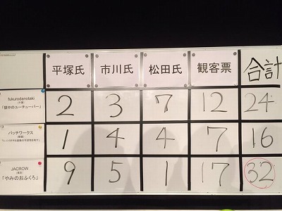 JUGEMテーマ:演劇・舞台 中村です。 前々回のブログにてお知らせした「えんとつ王」に参加してきたので結果をご報告します。ちなみに前々回のブログでは出演者しか記載していなかったので、改めてスタッフを紹介します。 第4回えんとつ王決定戦参加作品 JACROW『やみのおふくろ』 脚本・演出:中村ノブアキ 出演:谷仲恵輔 狩野和馬 演出助手:関智恵 方言指導:根津茂尚 照明操作:小平伸一郎 という布陣で挑戦しました。 予選ですが、以...