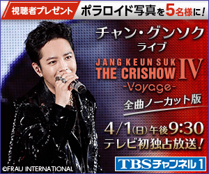 https://twitter.com/tbschannel/status/979916223449214976 チャン・グンソクライブ THE CRISHOW IV-Voyage- 全曲ノーカット版 TBSチャンネル1 (CS296/プレミアムサービス616) 放送日時【初回】:2018年4月1日(日)21:30〜4月2日(月)0:00 【再放送】:2018年4月15日(日)19:30〜22:00 【収録:2018年1月18日(木)〜大阪城ホール】 チャン・グンソクライブ THE CRISHOW ROCKUMENTARY 全曲ノーカット版〜舞台裏も見せますスペシャル〜 放送日時【再放送】:2018年4月8日(日)午前8:30〜午前11:00 【...