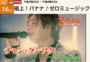 極上!バナナ♪ゼロミュージック「世界の音楽クイズスペシャル」 8/16(水)午後7時30分〜 午後8時43分 韓流スターのチャン・グンソクが個性的すぎる絵でお絵かきクイズを出題。 【司会】バナナマン,杉浦友紀, 【出演】井戸田潤,鬼龍院翔,歌広場淳,田中卓志,秋元真夏,生田絵梨花,松村沙友理,槇原敬之,オースティン・マホーン,小野リサ,JKT48,チャン・グンソク,Little Glee Monster,藤村聡之,花柳糸之社中,オルケスタ・“バナナゼロ”ムジカ http://www4.nhk.or.jp/bananazero/x/2017-08-16/21/5835/3121129/ <...