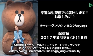 ニューアルバム「Voyage」の発売を記念して、8/9(水)にLINE LIVE生配信が決定! 78万人以上のユーザー数を持つLINE公式・アカウント内で、7/26(水)より配信スタートしたチャレンジ企画「いきなりLEZ GO!」が話題となっているチャン・グンソクがついに生配信でアルバムについての制作秘話や全曲解説を語る。 MCにはチャン・グンソクのファンクラブイベント等でおなじみのYumiを迎え、ここでしか聞けないスペシャルなトークを展開する。 さらに番組内で、昨年のLINE LIVEで大好評だった生電話が一夜限りで復活!! チャン・グ...