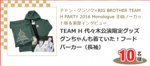 TBSチャンネル「新春ファン感謝祭2017〜超豪華!人気番組グッズ&特撰カニづくしプレゼント!!〜」 チャン・グンソク×BIG BROTHER TEAM H PARTY 2016 Monologue 全曲ノーカット版&楽屋インタビュー TEAM H 代々木公演限定グッズ グンちゃんも着ていた!フードパーカー(長袖) 10名様 <応募はこちら> http://www.tbs.co.jp/tbs-ch/special/fankansha2017/ チャン・グンソク×BIG BROTHER TEAM H PARTY 2016 Monologue 全曲ノーカット版&楽屋インタビュー <放送日> 1/22(日)深夜3:20〜翌午前5:40 http:...