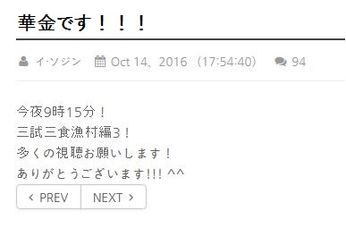 JUGEMテーマ:「三試三食」〜自給自足の有機ライフ〜 JUGEMテーマ:「三試三食」漁村編3 JUGEMテーマ:イ・ソジン [イ・ソジン] ブログ村キーワード おおおお〜〜〜( ̄□ ̄;)♪♪ ↑ イソジンssiが、久しぶりに【韓国公式サイト】にメッセージを投稿されましたよ〜〜(@^▽^@)…投稿された日時を見ると、14日(金)の本放送の始まる3時間ほど前…♪♪タイトルの〈華金〉は、日本でも使う「花金」と同じニュアンス〜〜(*´∀`...