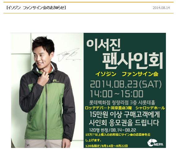 JUGEMテーマ:韓流ドラマ「本当に良い時代」 JUGEMテーマ:イ・ソジン [イ・ソジン] ブログ村キーワード 2014.8.14 追記 : 先ほど、【日本公式FC】の《ニュース欄》に、運営チームの方から、23日のサイン会についての追加のお知らせが更新されました…やはり、…(T ^ T)…残念ながら韓国のネパ社の告知通りで、今日14日〜22日までの間に、清涼里デパート店にて15万₩以上商品を購入した人だけに、【サイン会】への参加券が入手できる…...
