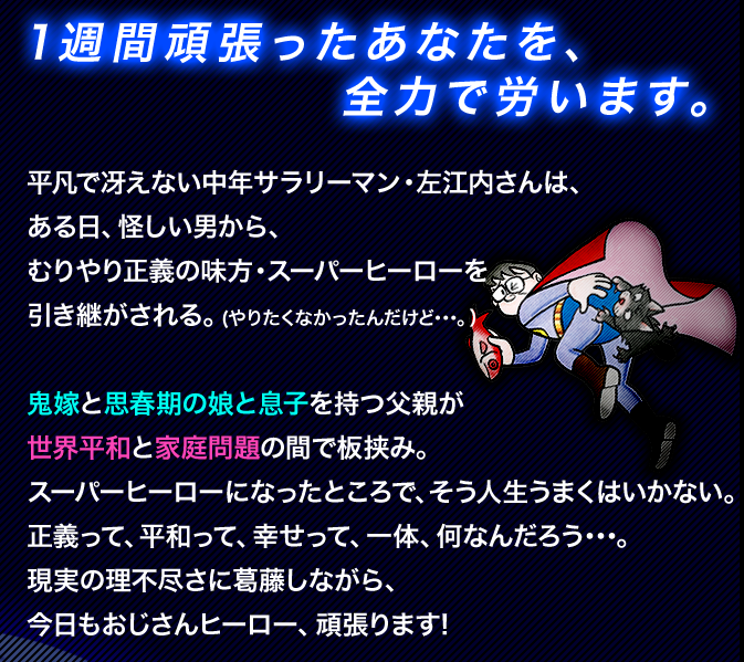 JUGEMテーマ:堤真一 スケートシーズンまっ只中ですが ここで堤さんの新ドラマのご案内をブッ込まさせていただきますw 来年1月から、「スーパーサラリーマン左江内(さえない)氏」というドラマに主演します! (公式サイトより) 番組公式サイトはコチラ → http://www.ntv.co.jp/saenai/ これは藤子・F・不二雄のマンガが原作。 あらすじは上記の通り。 で、つまんない事件を解決するべく奔走し しかもこのスーツを脱いだら、当事者は見...